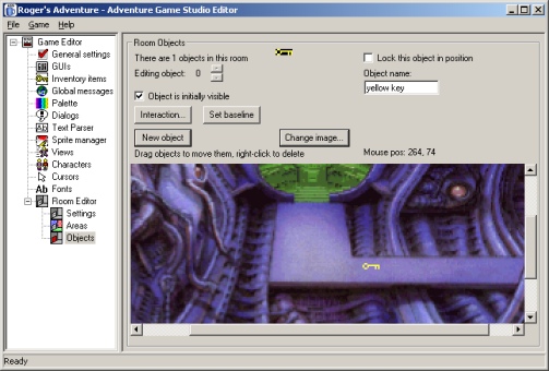 You should now be returned to the Objects pane, and see that the blue cup has changed into a key. You can move it around by left-clicking and dragging the sprite within the background image. Place it somewhere sensible on your screen. Also, notice in the top part of the editor is an "Object name" box. This allows you to name the item, similar to the Hotspot Name box for hotspots.