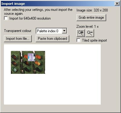 If you just want to import the entire image as your sprite, simply click the "Grab entire image" button. Otherwise, move and size the selection rectangle so that it covers what you want to import, and click the left mouse button. The "Zoom out" and "Zoom in" buttons allow you to zoom in on the sprite to see more detail if you need to precisely align your import rectangle.