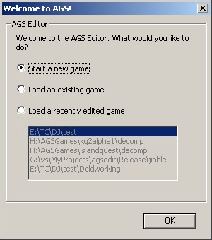 Now, you feel you're ready to go ahead and make a game of your own. So, start up the AGS Editor by double-clicking the AGSEDIT.EXE file, and you should be greeted by the following screen: