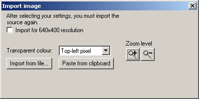 The first thing to do is to set what resolution the image is drawn for. Basically, if you are making a 640x480 game, you need to check the "Import for 640x400 resolution" box before going any further. If you are making a 320x200 game, leave it unchecked.