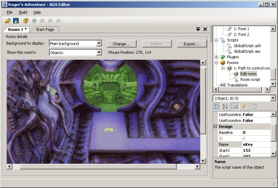 The next thing we should do is give the object a name. Similar to what we did with hotspots, since the object will be referred to in the script it'll need a name that we can call it by. Scroll down the property grid and find the "Name" property, and set it to something sensible. The convention in AGS is to have object names start with an "o", for example oKey.
