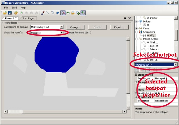Hotspots are drawn in exactly the same way as walk-behind and walkable areas. You'll probably want to use several different Hotspots for different areas of the screen. After drawing your first hotspot, change the Selected Hotspot using the drop-down list above the property grid, and you can draw in a different colour. All the other hotspots will be greyed out.