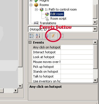 You'll see that the property grid changes to list all the events for this hotspot. Events occur when the player does certain things in the game. At the moment, nothing is set to happen in response to any of the events, so whatever the player does to the hotspot, they will get no reply.