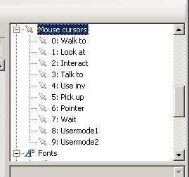 The Cursors editor pane is fairly self-explanatory. Use the property grid to set a graphic for the cursor; and click inside the graphic to set the cursor's hotspot, as we did for inventory items. (The hotspot sets which spot under the cursor will be activated when you click with it).