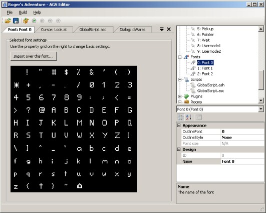 By default, you'll see three fonts are available. Font 0 is the standard font used in message boxes. Font 1 is the speech font, used with lucasarts-style speech; and font 2 is an outline font for the speech font.