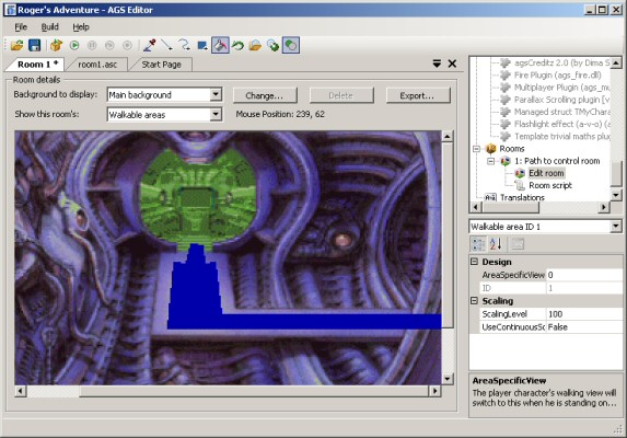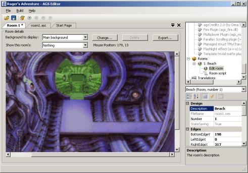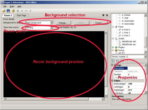 In AGS, games are made up of several rooms, which the player moves between in order to play the game. Each room is one screen that has its own background, hotspots and objects.