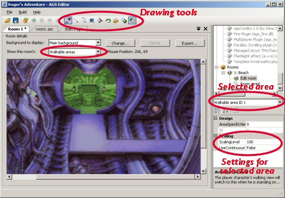 In the toolbar you'll notice that some new buttons have appeared. These are the drawing tools, and work in a similar way to most paint packages. AGS provides Line, Freehand, Rectangle and Fill tools. Alternatively, you can draw your walkable area mask in a paint package and import it (we'll cover that later).